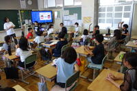 どのクラスの子供たちも、電子黒板に終始注目して、集中して話を聞いていました。校長先生の話の中では、4月からこれまでの子供たちの様子を画像で紹介しながら、途中、クイズも入れて楽しくふり返りました。夏休みに頑張ってほしいことも伝えられ、子供たちは、夏休みへの期待と意欲が更に高まったようでした。