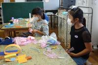 輪っかを使って、自分のイメージに合わせたものを作っています。頭飾りや腕飾りに、折り紙で作ったものを付けて、素敵な作品を製作しています。