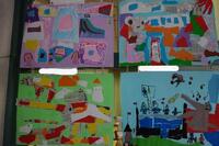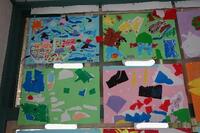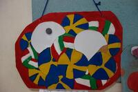 折り紙や色画用紙を自由にちぎって、組み合わせていきました。1年生の自由な発想が素敵だなと思います。皆さんは、何に見えますか?