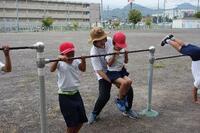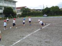 学習指導要領では、走・跳の運動のなかで「児童の実態に応じて投の運動を加えて指導することができる」ことが明記されました。ここでいう「投の運動」は、「遠くに力一杯投げること」に指導のねらいが置かれています。ロケットボールを使って、基本動作の確認をしました。