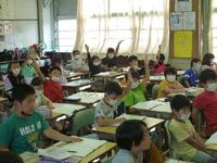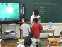ALTと英語の学習の様子です。今日は、英語を使った挨拶の仕方と動物、色の学習をしました。色については、馴染みがあるためか子供たちはスムースに発声することができました。動物については、子供たちが首を傾げたり、「ん?」と聞き返したりしたため、ALTが繰りかえし英語で発声をし子供たちの耳に慣れるようにしていきました。