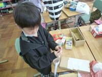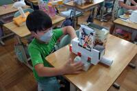算数で「かたち」の学習をしています。今日は、自分で用意した箱を使って、ロボット、動物、乗り物など好きなものを作りました。「作りたいものがあるけど材料が足りない友達がいるよ。」と声を掛けると、ある子が次のように答えました。「家で、困っている子がいたら分けてあげてねと言われたよ。」と。心がほっこりしました。