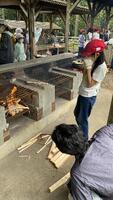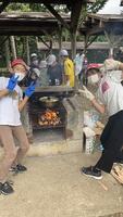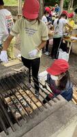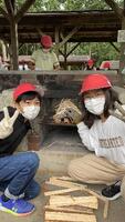 朝食はかまどで薪をくべて、ホットドッグを作りました。普段ならトースターでパンを焼くのですが、トースターはありませんので火起こしからの作業になります。とても上手に焼けました!