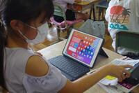 5年生は、「小数のかけ算」を学習しています。ノートに計算をした後、タブレットの計算ソフトを使って、自分で答え合わせをしていました。
