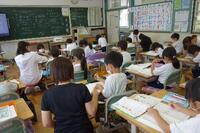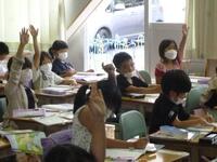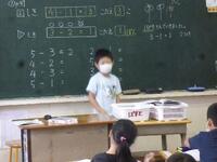 1年生の算数です。友達と解き方や答えを確認して、前で発表します。「私も」とたくさんの人が発表に挑戦していました。