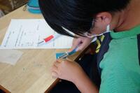 分度器と定規、三角定規を使って、2つの角度・底辺を指定された三角形の作図に取り組んでいます。片方の手で、ずれないようにしっかりと定規を押さえていました。分度器の使い方にも、慣れてきました。