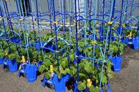 キュウリ(写真中央)も2本、収穫できそうです。ナス(写真右)は、花がたくさん咲いていました。もう少しで、実ができてきそうです。