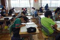 4年生は、教科書にある「元気」という文字を練習しました。2年生は、筆に慣れる練習中です。