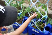 休み時間には、自分の鉢に植えたミニトマトの様子を観察に来ていました。小さい青色の実を見つけると、「先生、先生、ぼくの赤ちゃんのミニトマトがなりました!」と教えてくれました。