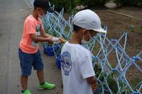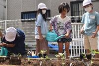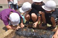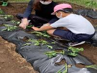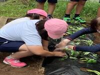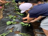 なかよし農園に、さつまいものつるをさしました。秋の収穫が楽しみです。
