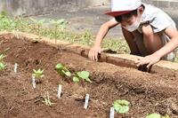 種から育てている野菜やお花の背が高くなってきたので、畑へ植え替えをしました。耕した土で畝(うね)を作るところから始め、水やりまで終えると、みんな汗びっしょり。元気に大きく育ちますように!