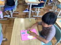 なかよし学級の子どもたちが、図工の時間に素敵な絵手紙「敬老の日カード」を作っていました。秋の果物のリンゴ、柿、葡萄などの絵とメッセージが描かれています。5組では、制作後の振り返りでタブレットを活用していました。作品を写真で撮り、ワークシートに貼りつけ、自分の感想を入力していきます。タブレット活用の経験も増え、操作にもずいぶん慣れてきています。