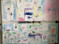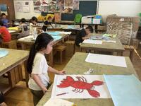 2年生は、夏休み前に生活科の学習で、ザリガニの飼育活動をたっぷりと楽しみました。ザリガニをじっくりと観察し、実際に触れて感じたこと、発見したことの経験を生かしながら、図工の絵画制作に取り組んだので、どの作品も躍動感にあふれたザリガニの姿が描かれています。絵画の制作過程も、仕上がった作品の鑑賞過程でも、とても楽しそうに、そして一生懸命に考えながら学習に参加している子供たちの姿が見られます。絵画の中に、その子の思いがたくさん込められている作品になっています。