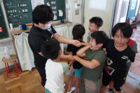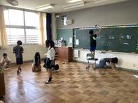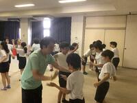 このところ熱中症の警戒指数が高く、休み時間の過ごし方や体育の授業に制約が出て、子どもたちも我慢を重ねています。今日も気温が高く、警戒レベルは「危険」です。そこで、4年生の子どもたちは、冷房設備のある多目的ホールを利用し、レクリエーションと体ほぐしを兼ねた運動に取り組みました。体幹や足腰の筋肉を使い、全身のバランス調整力も必要な「ぞうきんひき」。二人組になり、片手でぞうきんを持ち、引っ張り合います。先に足の位置が動いてしまった方が負けとなります。やってみると力の入れ加減や抜き加減に工夫が必要で、相手との駆け引きがとても楽しい運動です。続いては、「押し相撲」。こちらも次々相手を変えながら、子どもたちは夢中になって、対戦を楽しんでいました。友達とのふれあいは、子どもたちのよいリフレッシュになったようです。