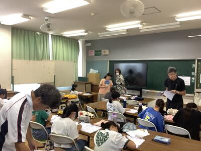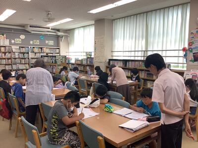 本日は、8名のボランティアの方々に指導者として参加をしていただき、50名を超える子どもたちが夏休みの宿題を持ってやってきました。