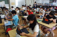 なかよし56組の授業の様子です。夏休み中に開かれる三嶋大祭りについて紹介する記事をタブレットを使ってまとめています。頼朝行列、流鏑馬、シャギリ、パレードなど、見どころが満載の大まつり。どれを取り上げようか悩むのもよくわかります。早く作業が進んだ子や、上級生の子どもたちは、積極的に仲間をサポートします。日頃から助け合いがよくできているなかよし学級です。