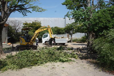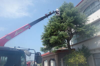 環境整備作業が行われた土曜日、他方で、ちびっこ広場内の樹木と南校舎昇降口横にある杉の剪定が、専門業者によって行われました。非常に暑い中での作業でしたが、さすがプロの技術。生い茂っていた木がどんどん剪定されていきました。森のようになり、木陰の機能ももっていた「ちびっこ広場」が、きれいさっぱり、明るくなりました。高い杉の木も、クレーン車を使っての高所作業。余計な枝が、みるみる切り落とされていく光景が圧巻でした。