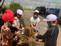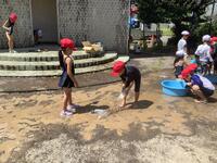 9月に入ったのに気温が高く、今日も熱中症に気をつけながら過ごしています。そんな中、ちびっ子広場から嬉しそうにはしゃぐ1年生の子どもたちの声が聞こえてきました。授業は生活科の「水遊び」です。子どもたちは、家庭からペットボトルやマヨネーズの空き容器など、様々な種類と大きさの容器を持ってきています。それらをふんだんに使って、お互いに水を掛け合ったり、遠くまで水を飛ばしたり、並べた容器の的あてを楽しんだりと、思い思いにのびのびと活動していました。シャボン玉が作れるコーナーもあり、こちらも大人気です。風にふわりと乗って飛んでいくシャボン玉がとてもきれいでした。「水に濡れるのって、気持ちいい~」という言葉には、見ていて大いに納得です。「先生も水かけてほしい?」という言葉には、優しい気遣いを感じつつ、こちらも笑顔で遠慮しておきました。