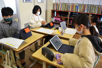 本やインターネットを使って調べたことを、班の友達に説明しています。「日本とにているところ、ちがうところ」「日本が支えられているところ」に注目し、アメリカ・中国・韓国・サウジアラビアの生活、文化・スポーツ、産業について伝え合いました。遠い国の文化に日本と似ている部分があったり、食料自給率のちがいの理由について話し合ったりすることを通して、国際社会における日本の役割やあり方について考えることができました。