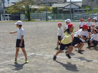 1組対2組のリレー対決です。これから各クラスで協力しながら、バトンの渡し方や受け取り方を練習して、チーム力を高めていきましょう。