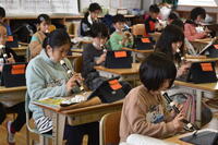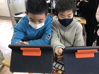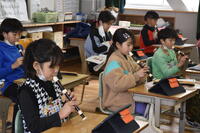 音楽室から、4年生のリコーダーの音色が聞こえてきました。高い音から低い音まで、両手の指を使って演奏します。楽譜はタブレットの画面で拡大できるので、とても見やすそうです。先生の指使いを見て確認しながら吹くこともでき、練習に工夫がされていました。みんなできれいな音楽を創り上げるのは、とても楽しいですね♪