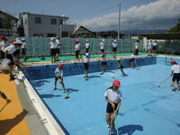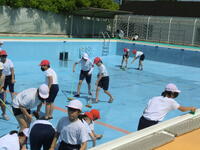 夏を思わせるような強い日差しの中、6年生の子供たちが、全校児童のためにプール清掃をしました。先月のPTA親子整備作業で、第1段階の作業は済んでいる状態のプールです。今日は、仕上げとして、プールの中やプールサイドの汚れ落としを行いました。この後水を入れ、いよいよ来週は、低水位で12年生のプール開きとなります。