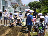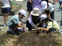 1年生の教室前の花壇に、今日はヒマワリの種と、コキアの苗を植えました。子供たちは、きれいな緑色でふさふさとしたコキアの苗が、秋には真っ赤に色づくことが信じられない様子です。これから花壇の様子を観察するのが楽しみになりますね。