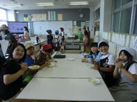 1年生の給食準備の様子です。配膳担当の子どもたちが、おかずをよそって、他の子どもたちがカフェテリア式にもらっていきます。1年生も慣れてきて、準備もだんだんとスムーズに行えるようになり「いただきます」までの時間が短くなってきました。