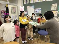 給食を食べるとき心がけることを給食委員が話した後、各学年から栄養士さん・調理員さんたちにプレゼントを渡しました。