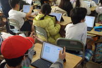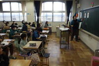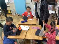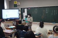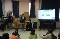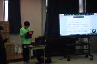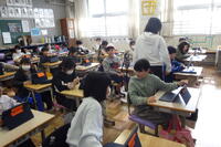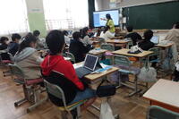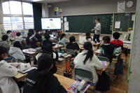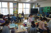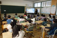 苗について、品種について、田んぼに棲む生き物についてなど、それぞれが注目する点をもって調べ、まとめた内容をタブレットを通して電子黒板に映して説明をしていました。