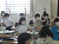 家庭科の授業です。野菜を食べているかの質問に多くの人が手をあげました。育ち盛りの今だからこそ、バランスの良い食事を心掛けましょう。