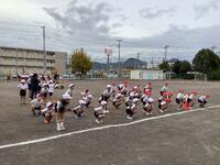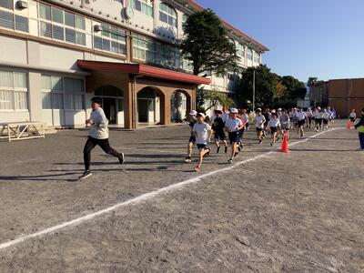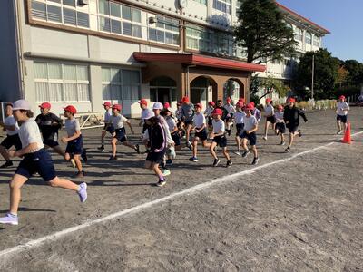 今週から、体力アップを目的にした朝運動がスタートしています。5・6年生は金曜日の朝に、この朝運動を行います。準備運動を行った後で、5分間走を行います。自分がどれ位の距離を走れたのか記録がわかるように、運動場には目安となるコーンが設置されています。今朝は少し肌寒い気温となりましたが、青空が広がっていました。参加した児童は、自分の目標に向けて一生懸命走っていました。