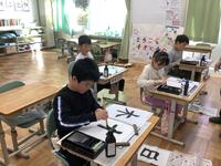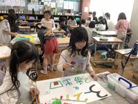 なかよし5組では、毛筆の練習です。個別に用意された練習課題を使って、「木」という題字に挑戦です。しんとした空気の中で、どの子も真剣に筆運びを行っていました。3年生は、2クラスとも大ぼうけんの準備です。看板を作ったり、店で使うものを作ったり、子どもたちは喜々として活動している雰囲気が伝わってきます。