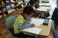 1年生の硬筆の授業の様子です。文字の形や書き順等、気を付けるところを先生が話しています。子供たちがしっかりと先生の話を聞いている様子が立派です。
