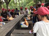具を挟んだパンをアルミホイルで巻き、牛乳パックに入れて直接火にかけて作るホットドックです。