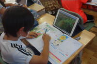 (中)花壇のホウセンカやヒマワリをタブレットで撮影し、気づいたことを書き込んでいます。