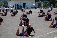団体演技の演技の動画を見て、動作の確認しています。「この手の動きがいいね。」、「腰がしっかり落ちているね。」本番が楽しみです。