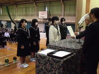 男女バスケットボール部、女子ソフトテニス部、吹奏楽部の大会やコンクールでの表彰と強化指定選手や書初めコンクールなどの個人の活躍についての表彰がありました。