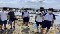 綺麗な砂浜にするために仲間と協力してプラスチックゴミを拾っています。