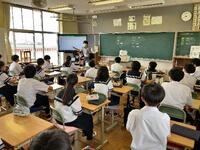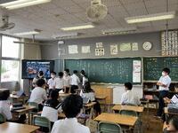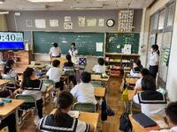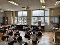 写真は4クラスをオンラインでつないで、一斉に説明を聞いている様子です。