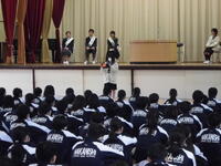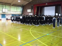 男女バスケットボール部、女子ソフトテニス部、吹奏楽部の大会やコンクールでの表彰と強化指定選手や書初めコンクールなどの個人の活躍についての表彰がありました。