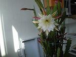 毎月、きれいな切り花を玄関の花瓶用に届けてくださってます。また、今月はクジャクサボテンの鉢を貸してくださっています。本日の早朝、きれいな白い花が一輪咲きました。