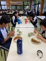 夕食タイムです。メニューはサラダ、スープ、カツカレー。いただきます。