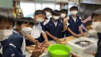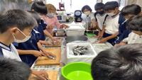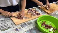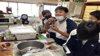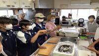 鯵の開き体験です。民宿の方に丁寧に教えてもらいながら取り組んでいます。初めての体験でドキドキしています。
