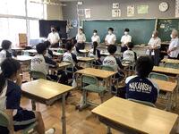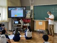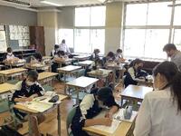 写真は4クラスをオンラインでつないで、一斉に説明を聞いている様子です。