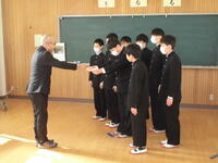 その後、校長から今年度を振り返るとともに感謝の思いをもって次の1月~3月を生活して欲しいこと、生徒指導担当からは、自転車の交通マナーやSNSの使い方等に注意して過ごすよう話がありました。
