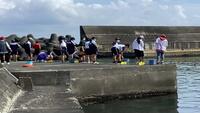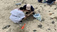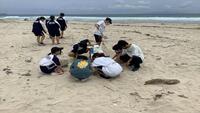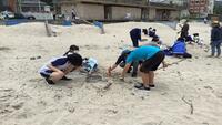 綺麗な砂浜にするために仲間と協力してプラスチックゴミを拾っています。