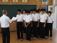 夏休み前の全校集会を実施しました。陸上400mで全国大会出場を決めた吉田明仁さんをはじめ、中体連地区大会で優勝した女子バレー部や女子ソフトテニス部などが表彰されました。