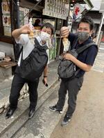 「落ちないソフトクリーム」を食べて生徒の受験合格を祈念する優しい3年部の先生たちです。