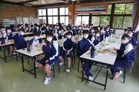 宿泊研修最後の食事です。良い天気のもとおにぎり弁当をクラスごと食べました。